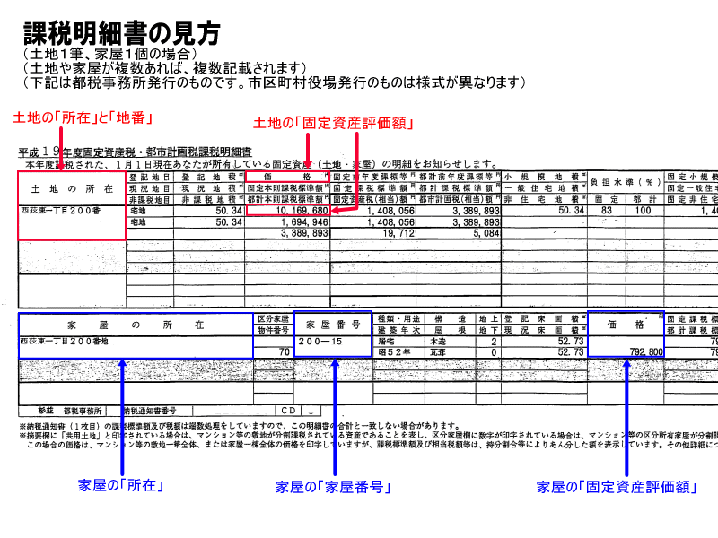 ↓以下は東京都税事務所発行の「課税明細書の見本」と「見方」です。