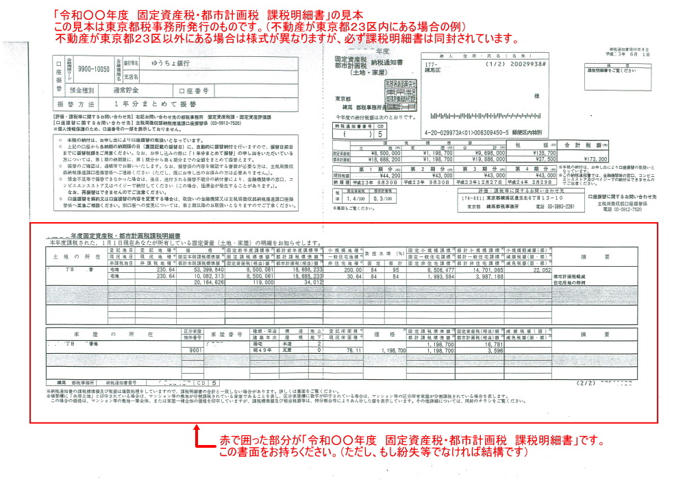 →毎年5月か6月に、不動産が東京都23区内にある場合は都税事務所から、不動産が東京都23区以外にある場合は市区町村役場から送られてくる、固定資産税の納税通知書に同封されています。